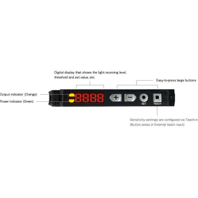 直覺數位操作:配備 4 位數 LED 顯示幕與大按鈕,支援多種 Teach-In (示教) 模式,設定簡便。